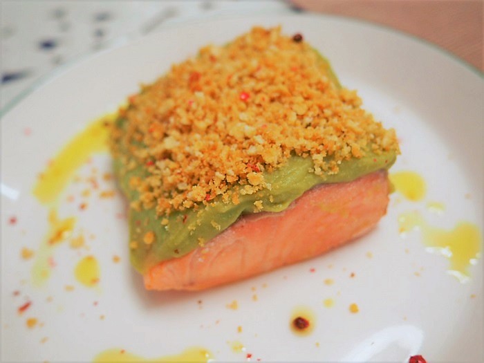 - サーモンの低温コンフィ そら豆のペースト パン粉のせ