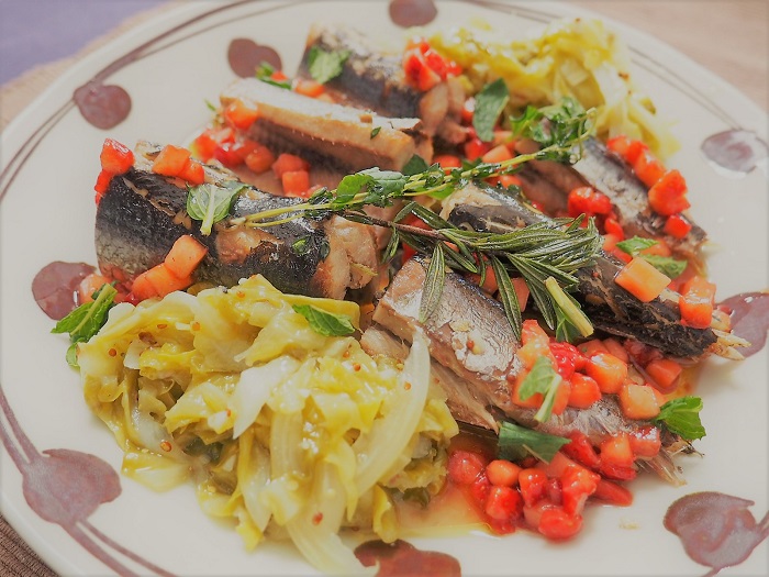 - 鰯のコンフィ いちごとバルサミコ酢のソース 春キャベツのマリネ