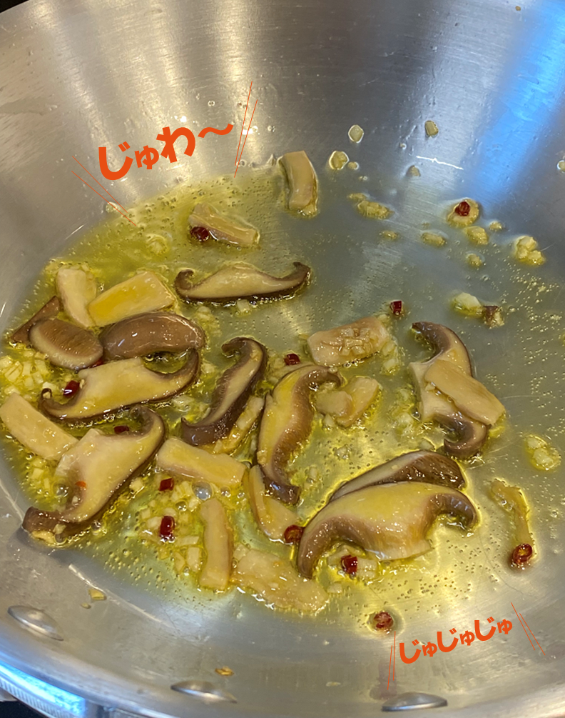 ・ニンニクと唐辛子をオリーブオイルで加熱。