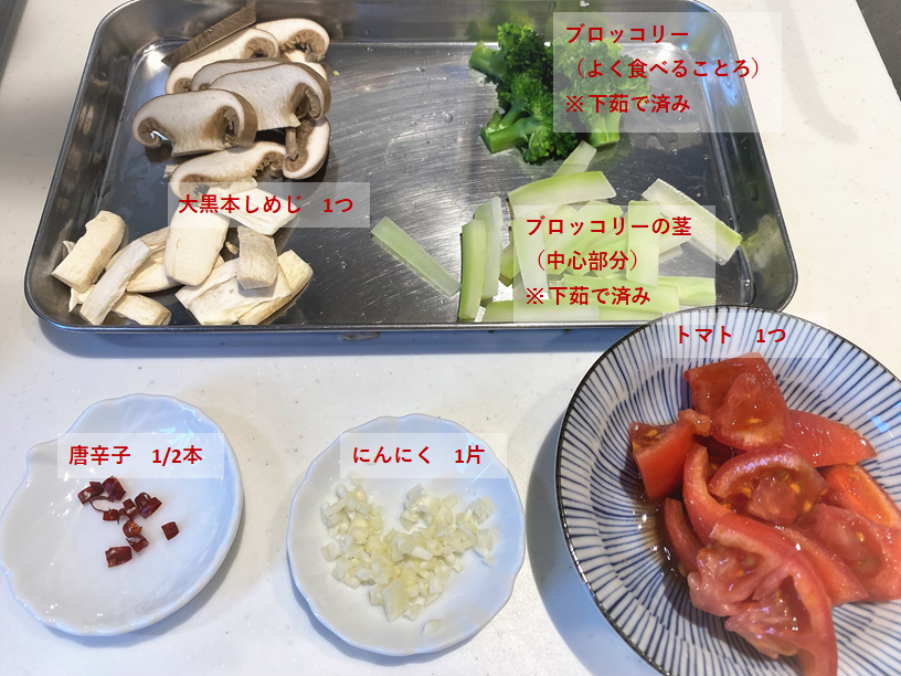 ペペロンチーノベースなのでニンニクと唐辛子。
