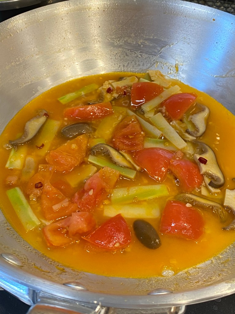 ・キノコの香りも立ったら、ブロッコリーの出汁を少し加える。
