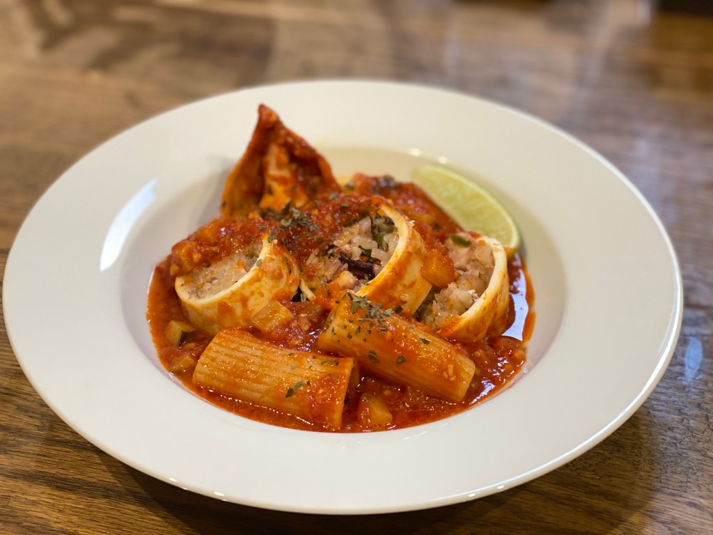胴体にピラフを詰めてショートパスタと共に